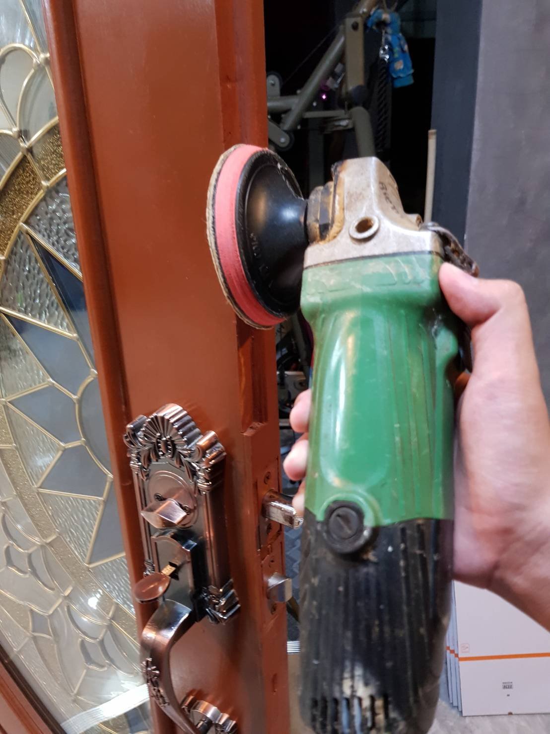 เมื่อถอดประตูออกมาแล้วให้ถอดกลอนประตูด้านที่ต้องไสไม้ออก เพื่อให้สามารถวางบานประตูบนพื้นหรือบนโต๊ะได้ จากนั้นจึงยึดบานประตูให้แน่นกับแม่แรงอัดไม้ แล้วจึงไสบานประตูด้านที่ต้องการปรับแต่งตามต้องการด้วยเครื่องเจียรลูกหมู ระวังอย่าไสออกเยอะเกินไป เพราะเมื่อประตูหดตัวจะทำให้เกิดช่องห่างมากเกินไป เมื่อเสร็จเรียบร้อยแล้วให้ประกอบตัวบานเข้าที่เดิม จากนั้นใช้ไขควงขันตะปูเกลียวยึดบานตัวบนสุดไล่ลงมา เป็นอันเสร็จเรียบร้อยครับ...